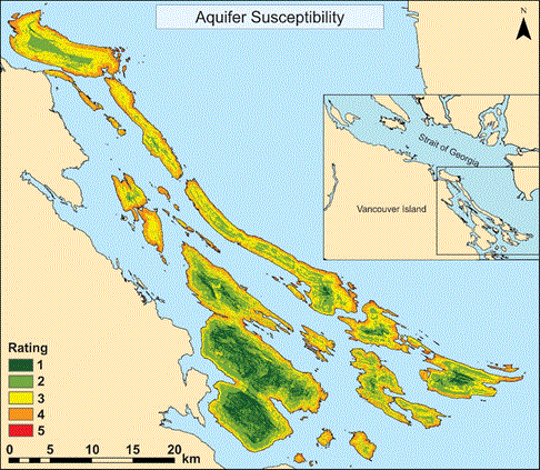 Aquifer vulnerability maps for the Gulf Islands were generated in previous research (Denny et al., 2007). However, these aquifer vulnerability maps focus on the susceptibility of the aquifer to chemical hazards associated with different activites at surface that can lead to the vertical migration of contraminants downward to the water table. (e.g. pesticides, chemical spills).