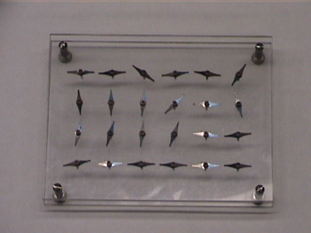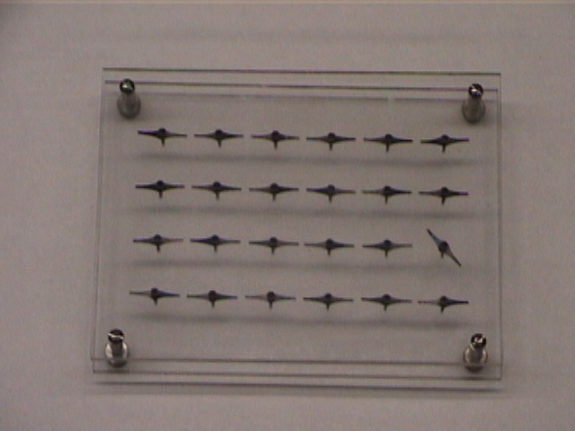 Description: An array of 24 compass needles (4 x 6) mounted on pivots may be used to demonstrate magnetic domains.