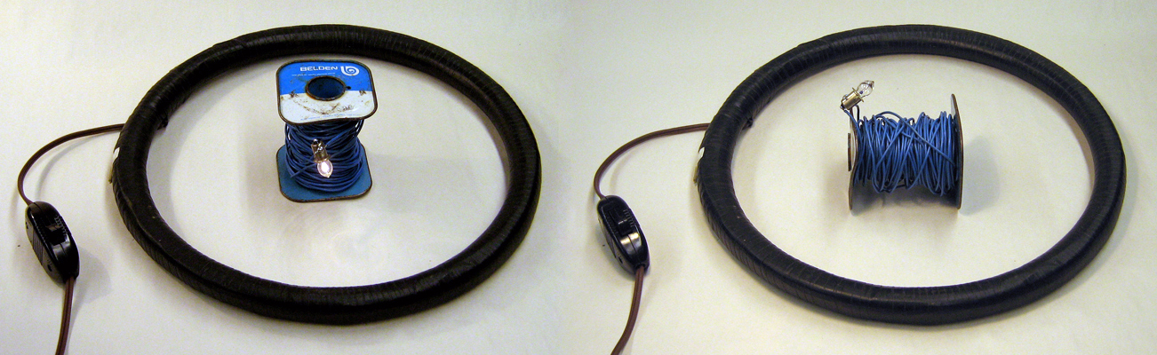 Original Construction: The coil of wire is a 100' spool of 20 gauge hook up wire. The two ends of the wire were soldered to a bulb to produce a closed loop with the bulb in series. The degaussing coil was purchased.