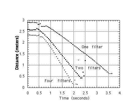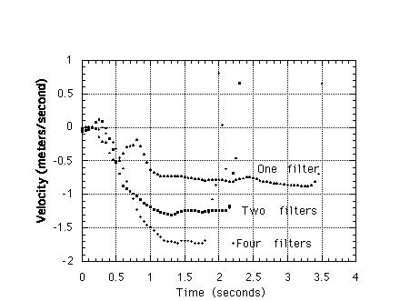 The velocity of the filters may be measured by means of the Vernier software motion sensor and MacMotion. Plots of the position and velocity as a function of time for filters from the Physics coffee machine (9.5 inches diameter when pressed flat, mass approximately 1.6 grams) are shown below for one, two and four filters. The position plots have been offset slightly so as not to interfere.