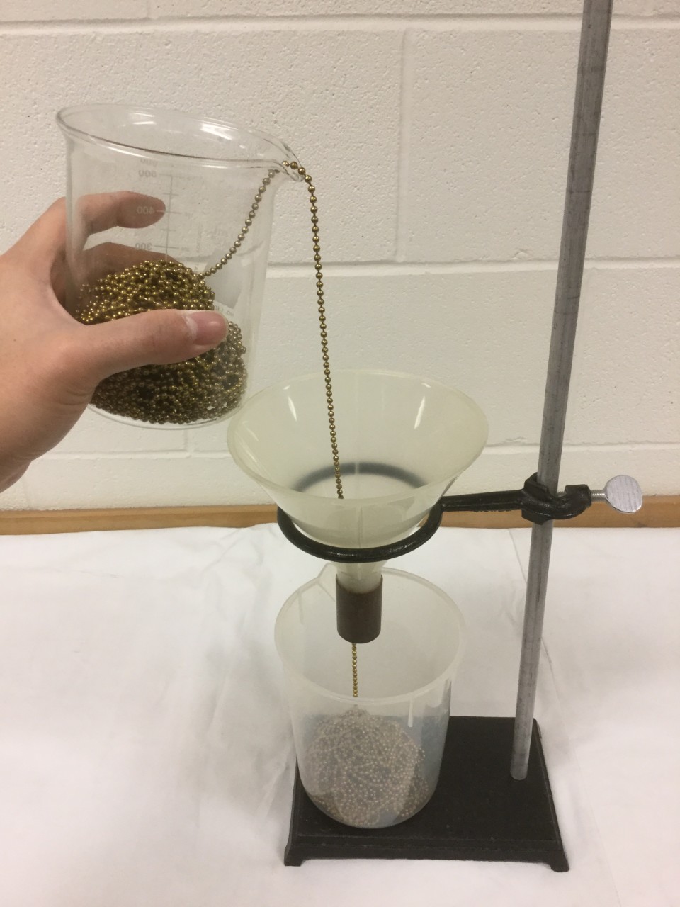 - Grab one red-taped end of the chain and feed it into the funnel. This should make the chain steadily siphon out of the top beaker.