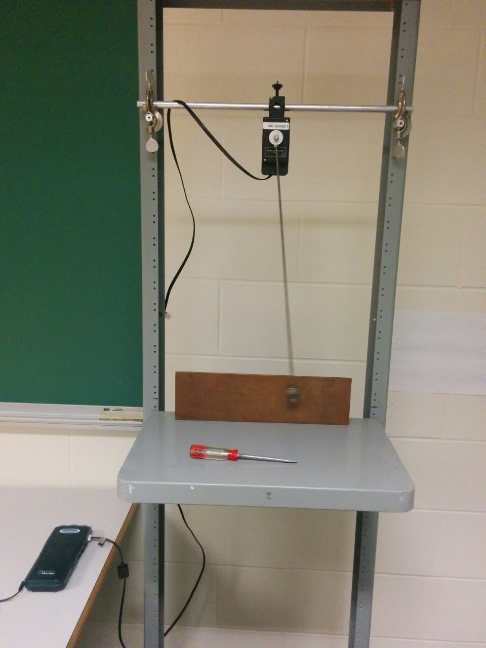 A magnetic mass hangs on the end of a swinging rod. A movable copper plate damps the oscillations. The rod is connected to a rotational motion sensor, which can transmit the data to a computer for graphing.
