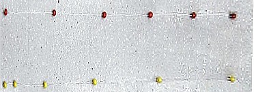 When the strings are dropped, the weights hit the ground one by one and the resulting impact is heard. Because of the acceleration due to gravity, the time between sounds for the equally spaced weights grows shorter, while the time between sounds for the squared interval weights remains constant. Note: despite the small size of the string, the sound of impact can be heard throughout a large lecture hall.