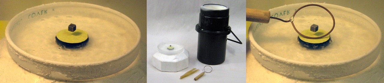 - Pour liquid nitrogen into the petri dish until the superconductor is fully submerged.