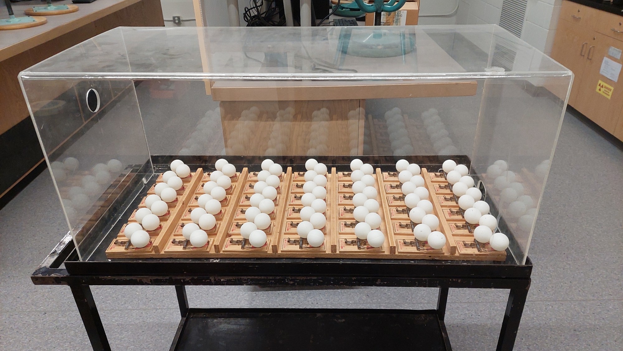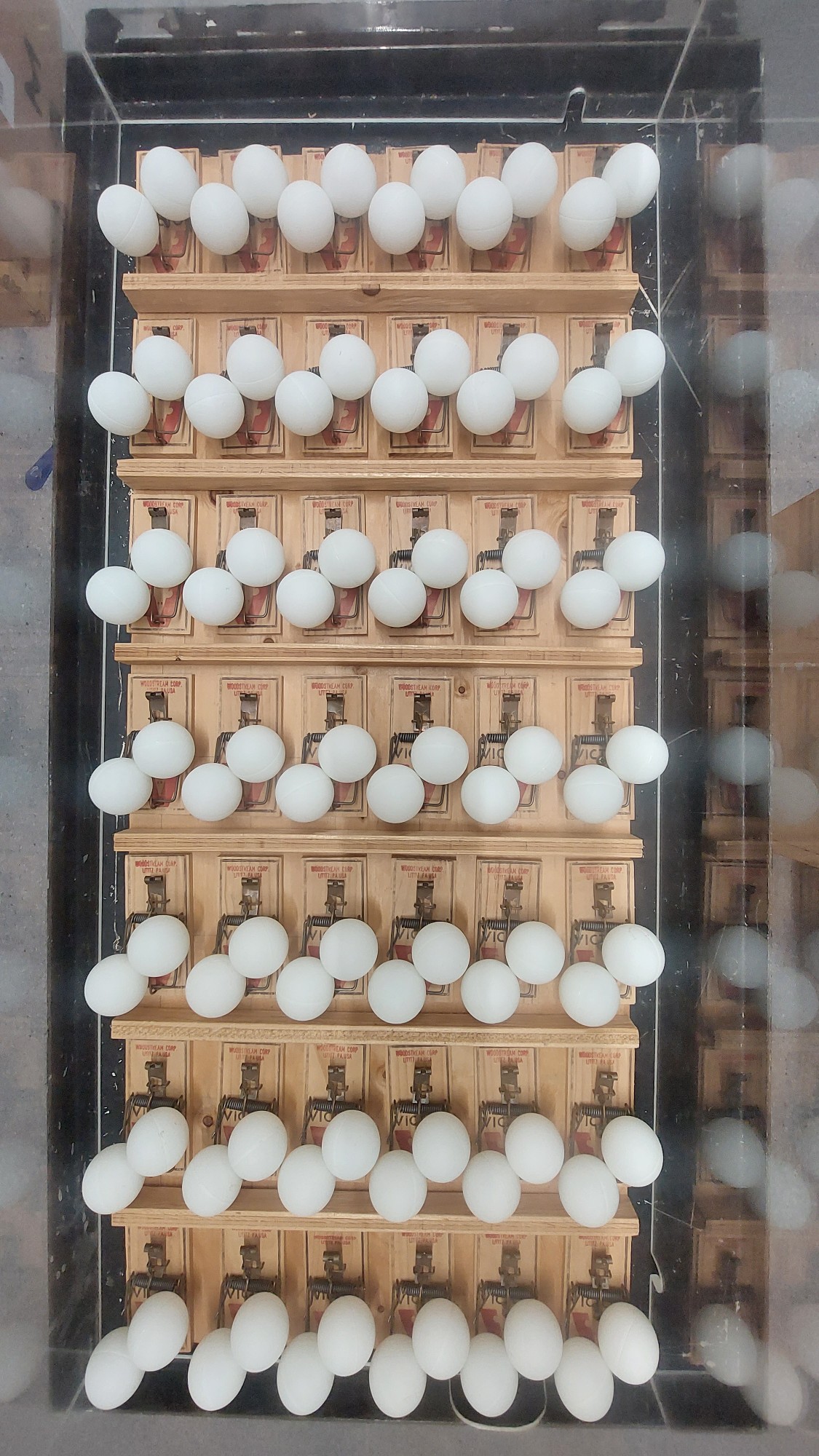 - With the Plexiglas cover off, drop a ping pong ball onto the array. One or two traps will go off, and their balls will fly across the room.