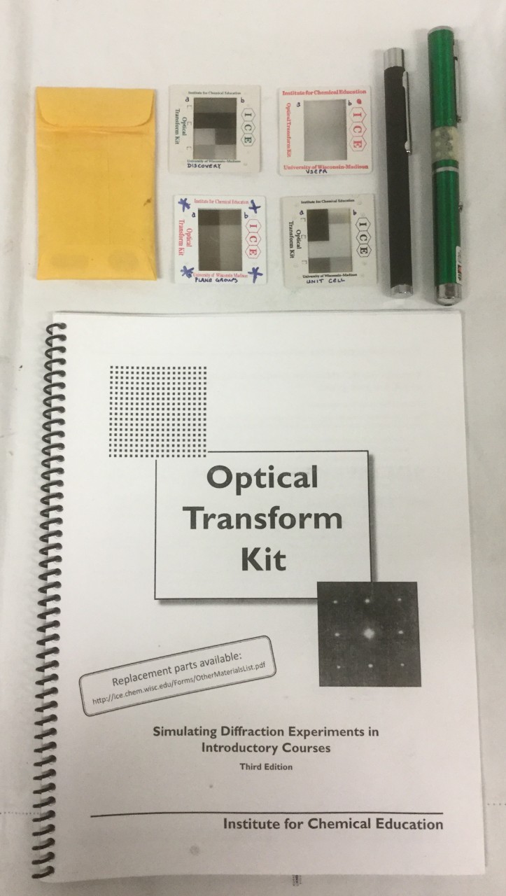 Specially made diffraction gratings use optical laser light to illustrate how wave-based material characterization techniques work, such as X-ray diffraction, electron diffraction, and neutron diffraction. Individual gratings explore the following themes: