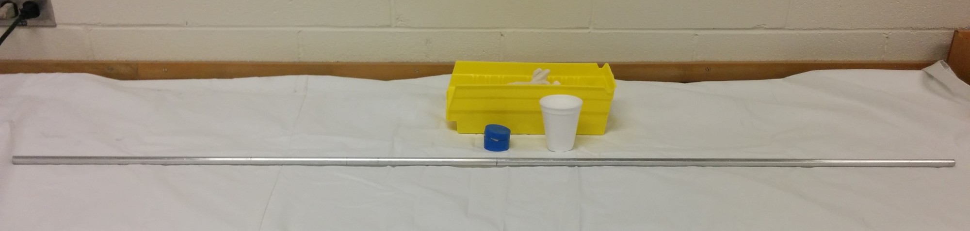 An aluminum rod is held at various nodal points and stroked with rosined fingers or gloves, producing a loud sound that lasts a long time. The sound can be amplified by touching the end of the rod to a styrofoam cup.