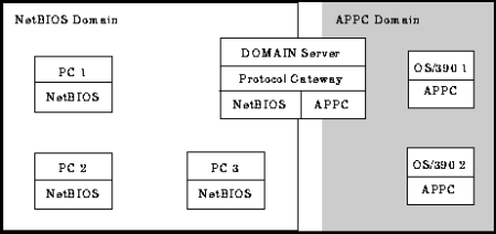 Within the NetBIOS domain, PC 1, PC 2, and PC 3 can intercommunicate using the NetBIOS access method. Within the APPC domain, PC 1, OS/390 1, and OS/390 2 can intercommunicate using the APPC access method. However, PC 2 and PC 3 cannot intercommunicate with OS/390 1 or OS/390 2 because they do not share a common access method.