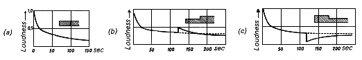 Decrease of loudness sensation through fatigue when the ear is taxed with a permanent sine wave, measured over 3 minutes. Hatched area shows time course of the signal for three cases: a) constant sound pressure; b) doubling of the pressure after 2 minutes; c) halving of the pressure after 2 min. (from F.Winckel, Music, Sound and Sensation, Dover, 1967, p. 104, used by permission).