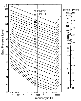 The Stevens method of LOUDNESS summation requires a knowledge of the SPL of the sound source over 8 octave bands, or alternatively in the 16 half-octave or 24 third-octave bands. Using the graph below or a chart, the loudness index for each band is found. The total loudness of the source in SONEs St is given by: