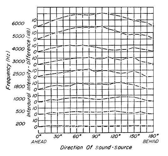 Interaural intensity differences as a function of the direction of the source (Feddersen et al., 1957).