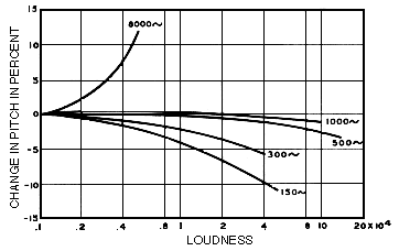 The change in pitch in percent with loudness for various frequencies as indicated on the curves (from Olson, Music, Physics and Engineering, Dover, 1967, p. 251, after Stevens, used by permission).In a very complex INHARMONIC spectrum, however, a sound may appear to have several pitch components. A sound with a continuously changing pitch is called a GLISSANDO. A pitch change caused by a moving sound source or observer is termed DOPPLER SHIFT.