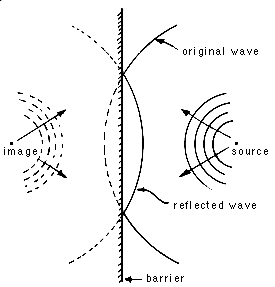 Reflection of a sound wave at a barrier, as if from an imaginary source at an equal distance behind the barrier.