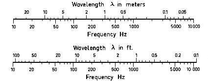 The velocity v of sound (see SPEED OF SOUND) in any medium equals the frequency f times the wavelength (v = f.l). Similarly if the velocity and frequency are known, the wavelength may be determined by dividing the velocity by the frequency (l = v / f). See chart below.