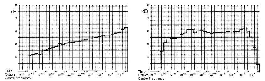 Third-octave spectrum of a white noise generator showing the characteristic increase of energy with frequency. By contrast, the nearly flat spectrum of the Athabaska River in Alberta is shown at right for comparison.