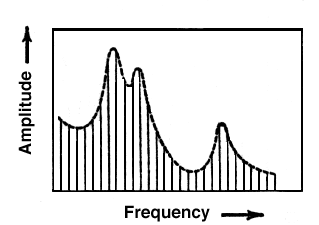 Spectrum of the vowel "ah" showing three formant regions. The vertical lines represent harmonics produced by vibration of the vocal cords and based on a low fundamental. These harmonics are resonated by the vocal tract to create the vowel's characteristic spectral shape.