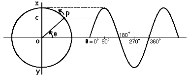 Geometric derivation of simple harmonic motion. A point p moves at constant speed on the circumference of a circle in counter-clockwise motion. Its projection OC on the vertical axis XOY is shown at right as a function of the angle θ. The function described is that of a sine wave.