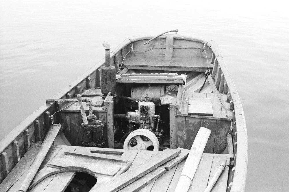 1. Seagulls calling in foreground, general rumble as background, intensity of rumble changes throughout as distant traffic decreases and increases. Cars passing on gravel. The occasional car horn (4'45", 5'10", 10'40", 11'30", 14'00", 15'15", 15'50", 16'40"). Truck horn (6'20"). Boat attempting to start, but failing (13'30", 15'00", 17'00"), finally makes it (17'40"). It has a nice pop-pop motor, that operates highly irregularly, sounds as if it will stop any minute, in fact it stops (19'30"), starts again (19'40"), stops (21'40"). The only acoustic indication that this was taped at waterfront is the presence of seagulls. Very urban soundscape, no water sounds. Thus the boat comes as a surprise, doesn't fit. Note also that seagulls disappear when boat starts.2. Wilson Manuel rowing to wharf. Talk starts (3'30"). Topics are: his boat; old boats (5'00"); boat whistles (8'00"); new foghorn (8'30"); first cars (9'00"); bells of Anglican church (11'25"). Sometimes hard to understand because he turns away from microphone. Another person joins them (13'00")