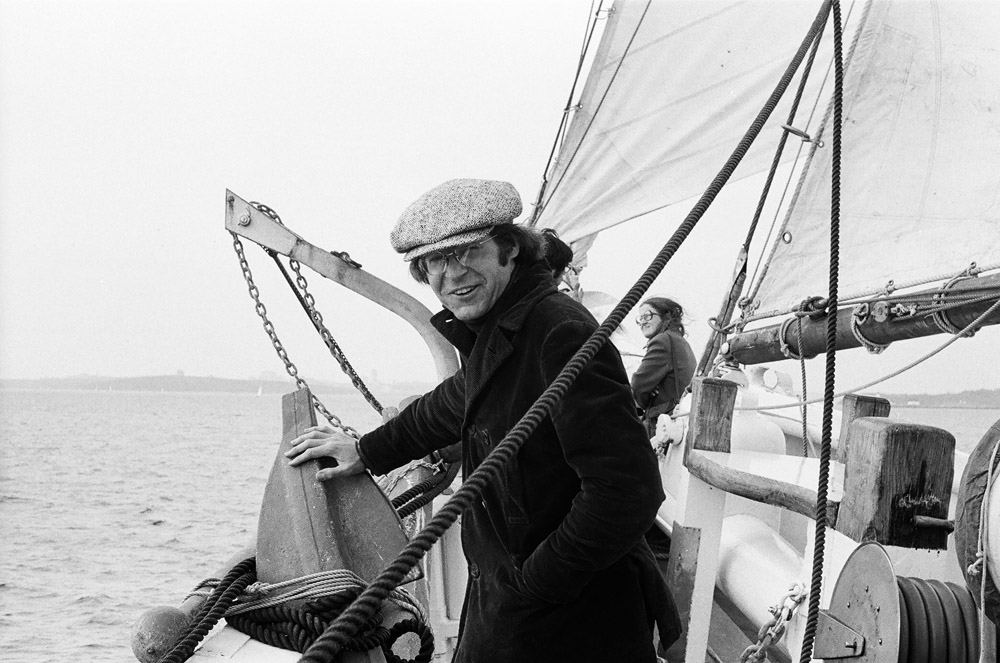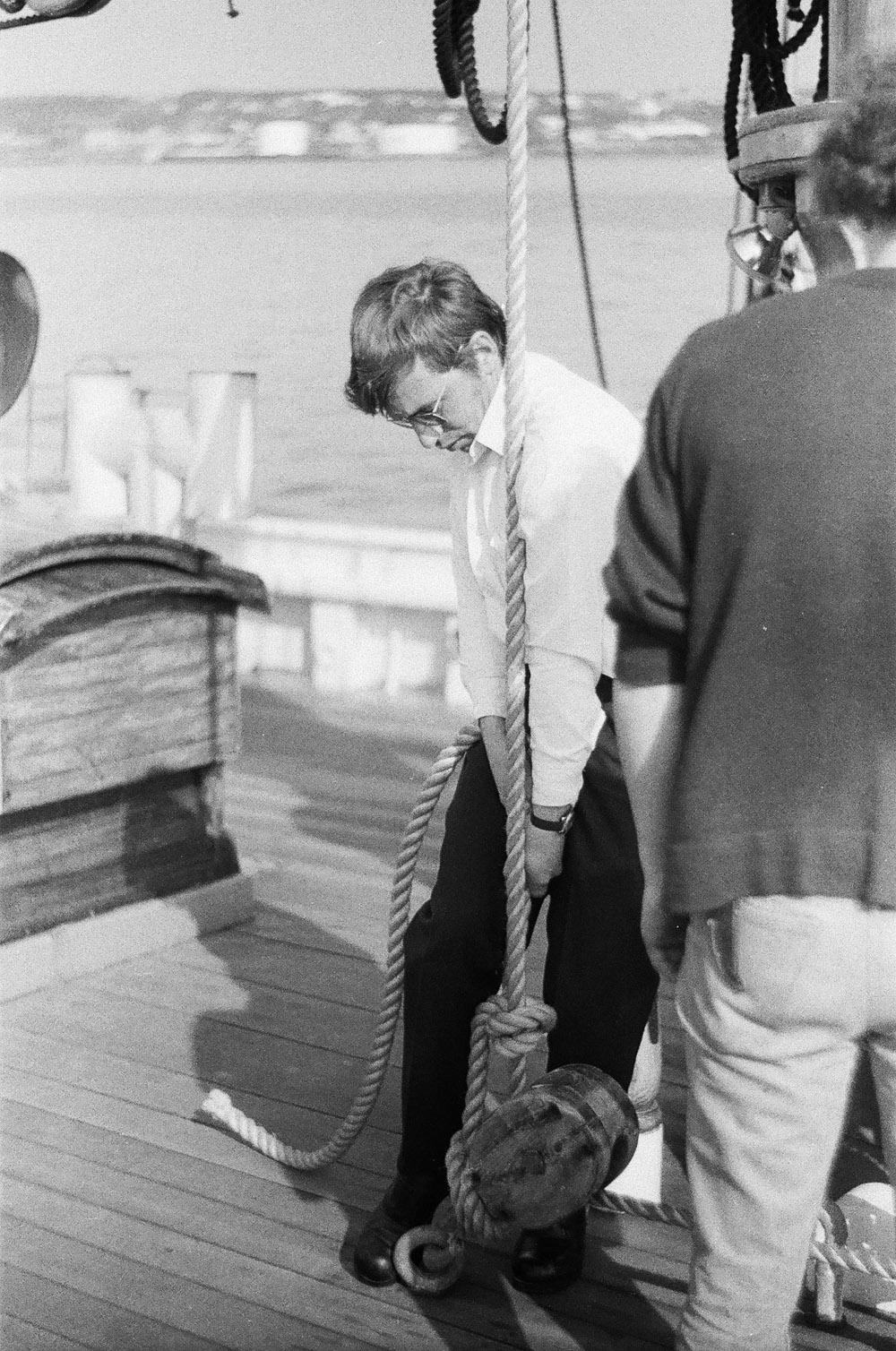 12. Continuous hum as sail is put up (1'20"), squeak accompanies the hum. Recordists move closer (2'00"), interesting crescendo. Motor stops as work is finished (3'05"). Lots of wind on microphone from 3'30" on.