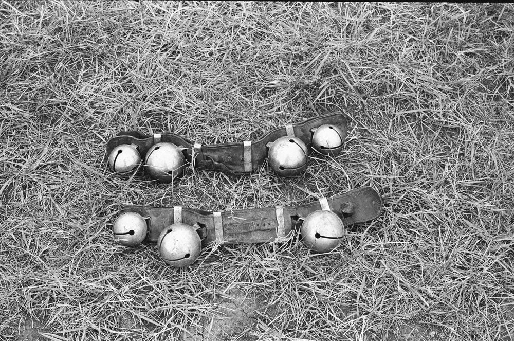 1. Two sets of 4 bells. Bruce running with them in circle (away from and toward microphones, 2x). Almost like a horse!2. Horse whinnying at beginning.