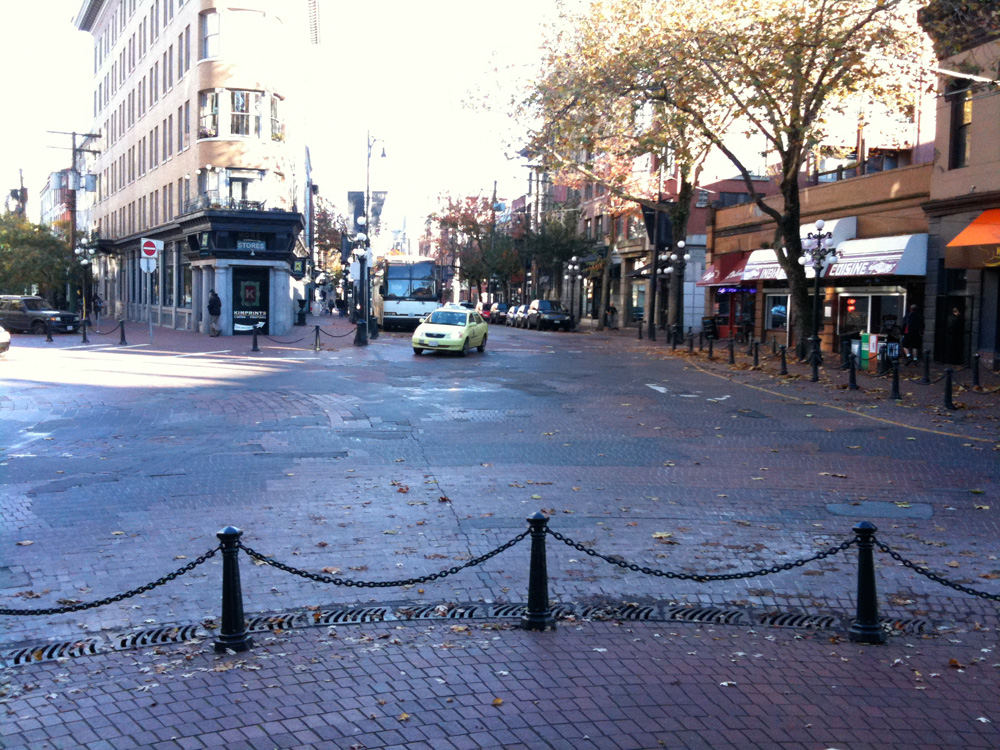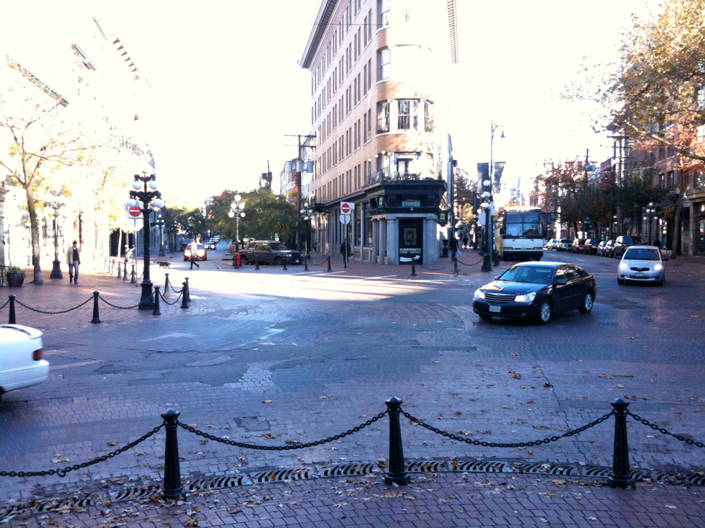 2. Corner of Powell, Carrall and Water St, traffic sounds, various footsteps and voices, hammering/construction in the distance, cars travelling over interlocked road is evident, truck passes at 1:58, 2:40 someone rolls a metal grocery basket past, distant seagulls at 3:20, 3:28 car wheels squeak over stones because of a sharp turn.