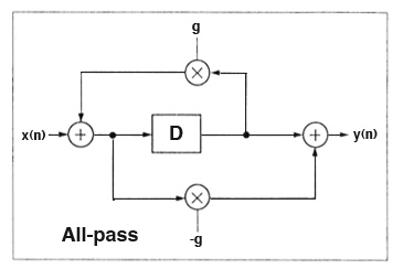 The samples themselves are usually multiplied by a gain coefficient, often labelled g, and are combined with the direct signal which goes from the input, x(n), to the output y(n) in these diagrams. The 1st order examples are called that because they use only the previous sample, whereas the 2nd order use the 2nd previous sample in the calculation.