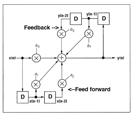 To complete this brief survey of digital filters, we have two more diagrams, the one at left showing an Infinite Impulse Response filter (IIR) which incorporates both the feed forward function that we saw above, that is, adding two previous input samples, x(n-1) and x(n-2), to the direct signal, as well as a feedback function that recirculates two of the previous output samples, y(n-1) and y(n-2). Note the gain values called coefficients are the various a, b values. This feedback function creates the “ringing” behaviour of theoretically infinite repetitions, similar to the various forms of audio feedback we will encounter later. Careful control over the feedback level will affect how long it lasts.