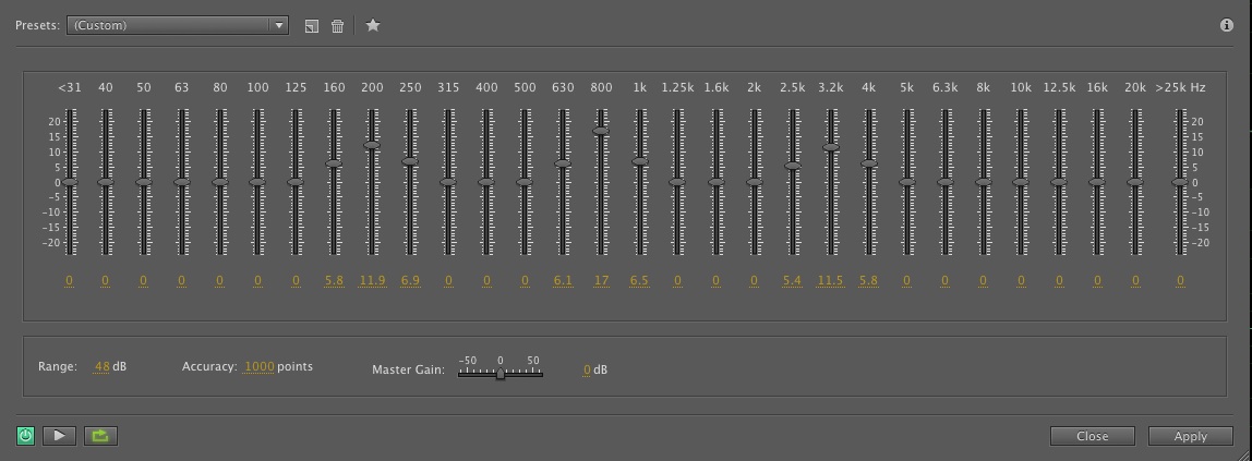 The recording is of the very large solo bell known as “Salvator Mundi” from the Salzburg cathedral, weighing 14,000 kg, and rung only on feast days. The bandpass that was used in Audition strongly attenuated the frequencies below 411 Hz and above 2 kHz, leaving the partials present that were more than two octaves above the fundamental. Then – strictly by ear, but also using the spectrogram – all 5 parametric bands were tuned to specific frequencies in the spectrum, giving them boosts from 13.6 dB to 17.7 dB. Note that the Q values are around 12-14, meaning quite narrow bandwidths. Given this amount of boosting, the Master Gain was dropped by 10 dB to prevent overload.