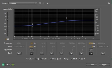 The recording is of a female professor giving a public introduction, and is of medium quality (we’ve all heard much worse). A parametric equalizer in Audition was used to give the voice more presence, first by rolling off the low frequencies with the high-pass filter, with a cut-off of 176 Hz (there is little energy in the female voice below 200 Hz, but the room itself was somewhat boomy, so this was needed). A roll-off of 18 dB/oct was chosen to not attenuate the lows too much (which would have made the voice sound more distant and less resonant).