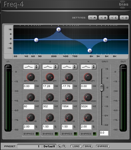 Tip: The GRM Equalizer default presets have some of these alternating band combinations, but since the lower gains go to zero, they do not cross-fade very smoothly, as the loudness drops in between presets. Raising the low gains to a higher value will correct this issue.
