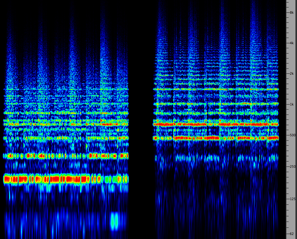 3. Start transposing your source or the excerpts up and/or down, depending on which range is strongest in the source. Although you can use any size of pitch transposition, doing it by octaves has several advantages; for an example of multi-octave transposition, see these examples where texture is involved. First, you can quickly get to the “end” of what is going to be usable in either directions. Remember the old saying: you don’t know you’ve gone too far until you’ve gone too far. Secondly, octave combinations always work well aurally, even if there are not actual pitches involved.