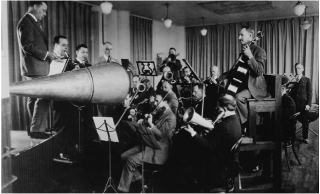 In this photo, we see a typical recording session from around 1920, prior to electrical amplification, where the sound of a musical ensemble had to be funneled into a cone-shaped tube and fed to a recording stylus. Since levels could not be controlled, louder instruments had to be placed farther away. It all looks rather crowded! An early reproduction device around 1905 was called the graphophone (or "pencil of sound") where the acoustic sound was recorded on a two-minute wax cylinder, produced by Columbia as a rival to Edison's version.