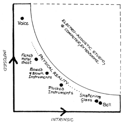 Trevor Wishart, in his book On Sonic Art, provides a useful model shown here about the form of acoustic energy input, from a singular impact through repetitive impacts, to continuous energy input. In his model at the lower right, a singular impact produces an intrinsic morphology (or sound shape) where the acoustic result is mainly about the internal properties of the struck object (although as we will demonstrate later in "dual processing" we can simultaneously identify the nature of the brief energy source). At the upper part of the diagram, continuous energy input has an aural result that is mainly about the gesture being imposed on the source. This distinction can also be described as follows: