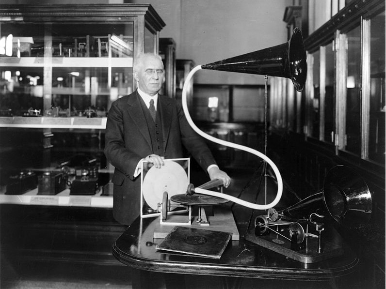 In the following diagrams we see Emile Berliner and the first phonograph, with its typical cone-shaped speaker, and in the ad for an early phonograph (1906) we see both the exponential horn, and a conical speaking tube to record sound. Prior to electrical amplification, these were the only methods to collect sounds or to radiate them by purely acoustic means. The frequency response was severely limited to the upper mid-range (250 Hz-3 kHz) which was sufficient for speech, but less adequate for music.