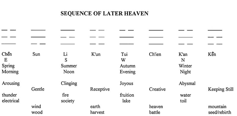 The sequence opens with the Arousing, signifying spring and morning, energized by thunder and electrical energy, and is followed by the Gentle, which finds its image in wind and wood, symbolizing organic development. Midsummer, or high noon, is evoked by the trigram known as the Clinging, referring to the light toward which the ruler of society turns, as organic life gives way to human consciousness. This is followed by the Receptive, which refers to the earth and the season of harvest, and in turn leads to the Joyous, as the year produces fruition and happiness. An abrupt change focusses on the Creative, symbolizing heaven, where the stern judgement of a battle between the forces of light and darkness is being fought. Winter ensues with the trigram of the Abysmal, where everything seeks its lowest level and the fullest concentration. The sequence ends with the trigram Keeping Still, symbolized by the Mountain, where the seeds of the new year and the new day are born.