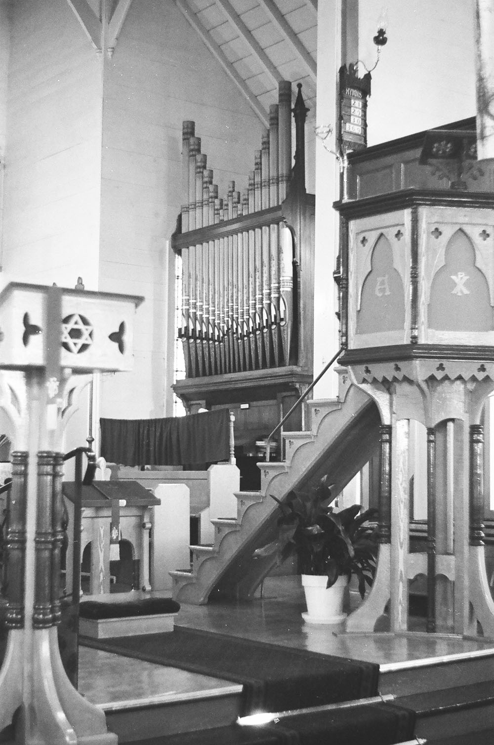 1. Note the quiet, reverberant ambience. Stoking of stove, putting in coal, fire, all very clear. Followed by conversation about stove, church and organ (3'30").2. He plays two short introductory pieces.
