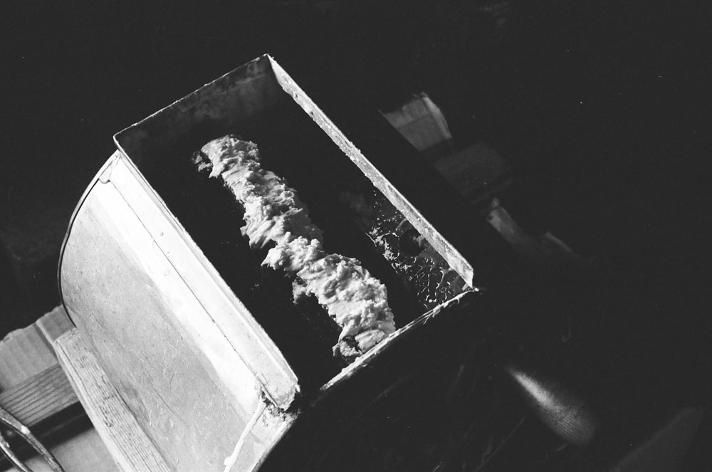 3. Wind blowing through door, it sings. Churning begins (40"). Note different rhythm and spectrum of this churn. Occasional whispering of recordists audible. As process continues, sound quality changes.