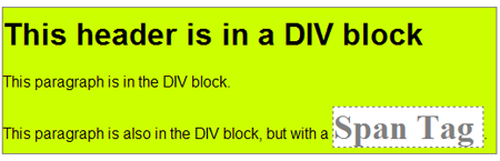 You can apply CSS to Div and Span in general or through ID/Class Selector; here we define the border so you can see precisely how the Div and Span are arranged.
