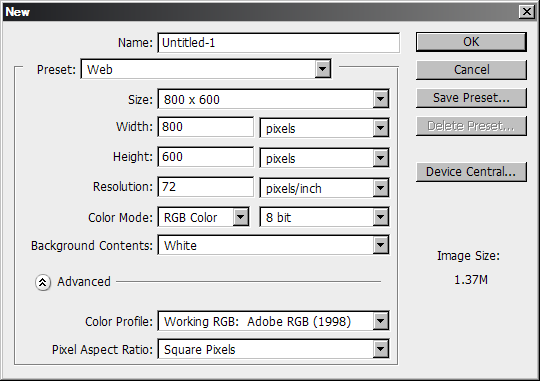 In the advanced setting, the color profile is a fairly complicated issue. It is not necessary or practical (in term of time budget we have) to understand it in the very beginning of this course. All you need to know is that Adobe RGB(1998) is industry standard color profile in North America. Once you finish the setting you can go ahead and click ok to begin your project work.