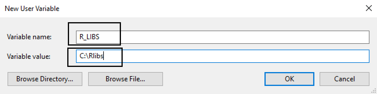 - Enter R_LIBS as the variable name. This MUST BE SPELLED EXACTLY as shown.