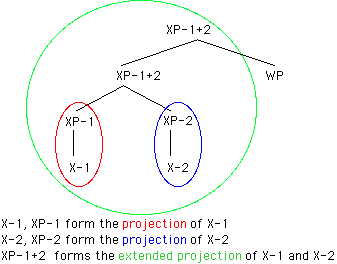 by XP-1+2. The node XP-1+2 forms the extended projection of X-1
