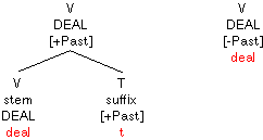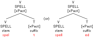 The feature is copied as above, and the verb splits into a stem and a suffix as above. However, [+Past] is not spelled out as the regular ending "-ed", but as "-t". To ensure that the ending is spelled out correctly, this information must be listed in the lexical entry for the verb:
