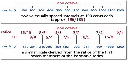 | The equal tempered tuning system in common use divides the octave into 12 equal divisions, each of which is 100 cents in size. | The cent system of interval measurement is useful for the analysis and specification of microtonal scales. |