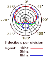 | A microphone's polar response describes its sensitivity to sound approching the microphone from various angles. The sensitivity variesfor different frequency ranges so the graph will usually indicate several of these to give amore accurate indication of the microphone's overall response characteristics.The graph to the right shows a typical response pattern for a cardioid (unidirectional) microphone at three different frequencies. | |