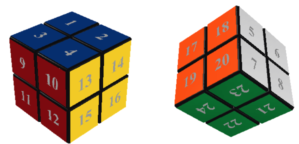 There is really only one aspect of the pocket cube that once needs to be careful in dealing with. There are no fixed-centres on this cube, unlike the 3×3×3 cube where each centre cubie remains fixed under face-twists. This means we have to be careful on how we fix an orientation of the cube in space. We'll see below how this affects our representation of the cube as a subgroup of $S_{34}$.