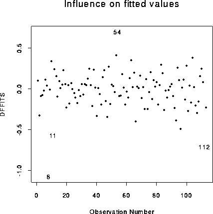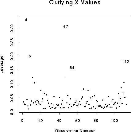 We find that observations 4, 8, 47, 54 and 112 have leverages over 0.15 (many more are over 10/113 the suggested cut off - I prefer to plot the leverages and look at the largest few). Observations 4 and 47, in particular, have leverages over 0.3 and should be looked at.