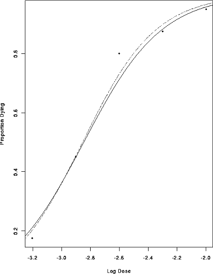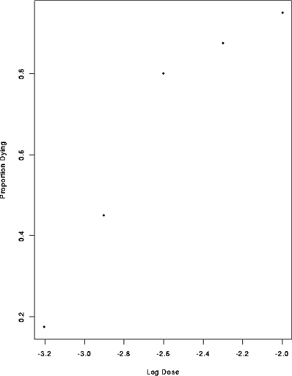At each of 5 doses of some drug 40 animals were tested and the number dying were recorded. The log doses are -3.204, -2.903, -2.602, -2.301, and -2.000 and the numbers surviving are 7, 18, 32, 35, 38. A plot of the data is