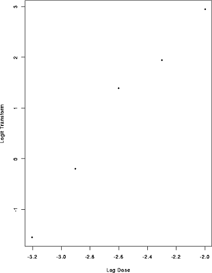 plot(Dose, log(Dead/(Tested-Dead)),xlab="Log Dose",ylab="Logit Transform")