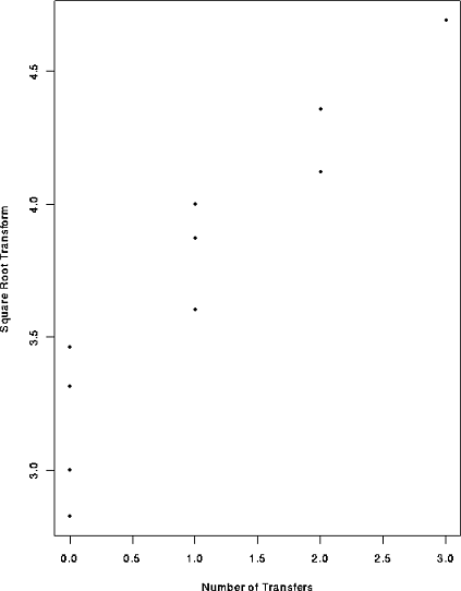 plot(Transfers, sqrt(Broken),xlab="Number of Transfers",ylab="Square Root Transform")