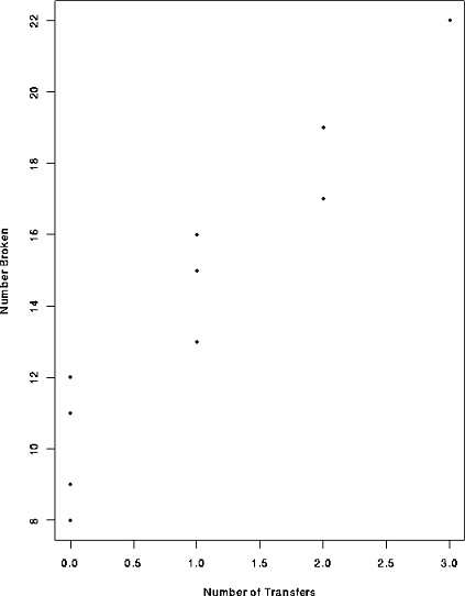 plot(Transfers,Broken,xlab="Number of Transfers",ylab="Number Broken")